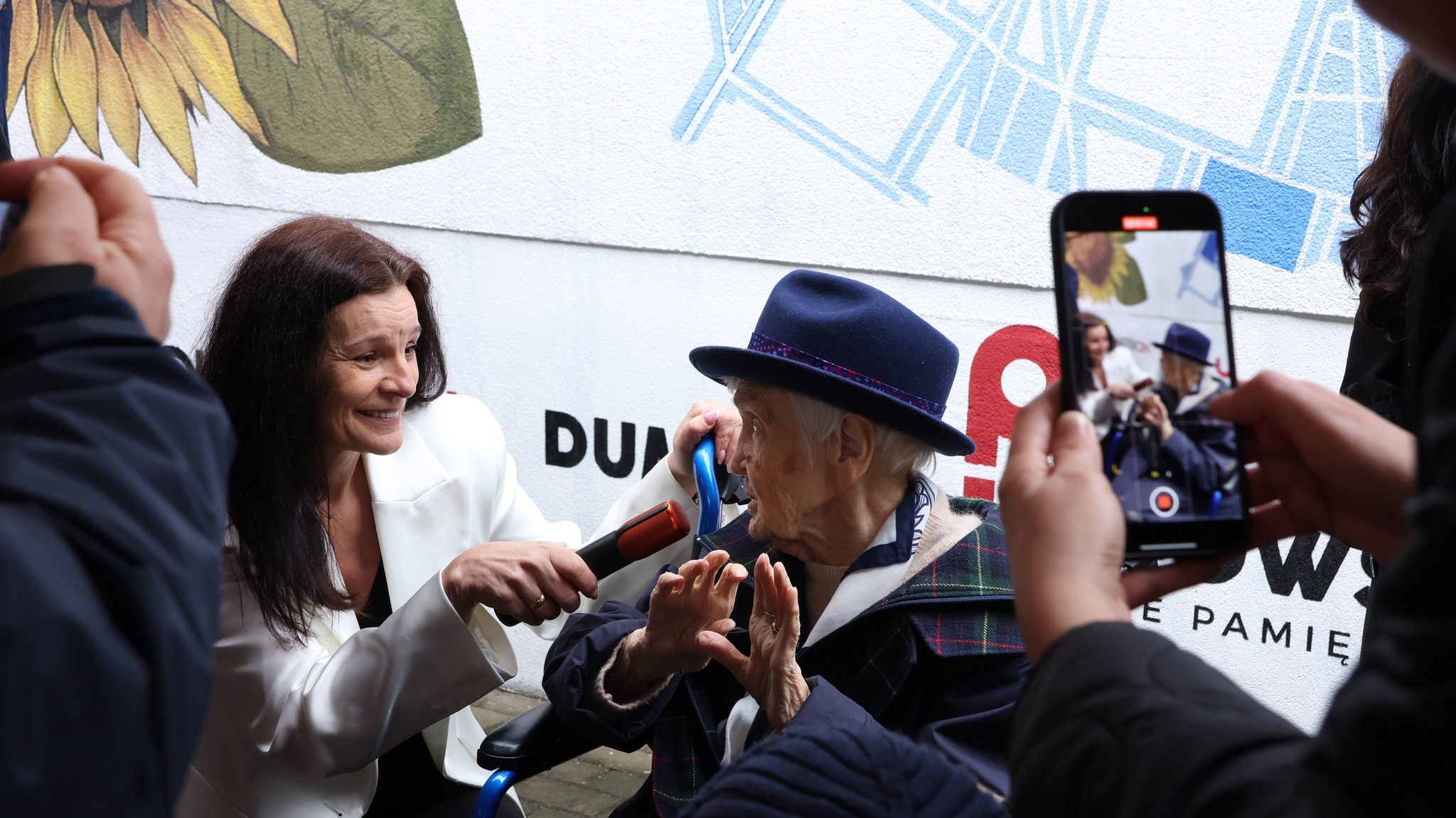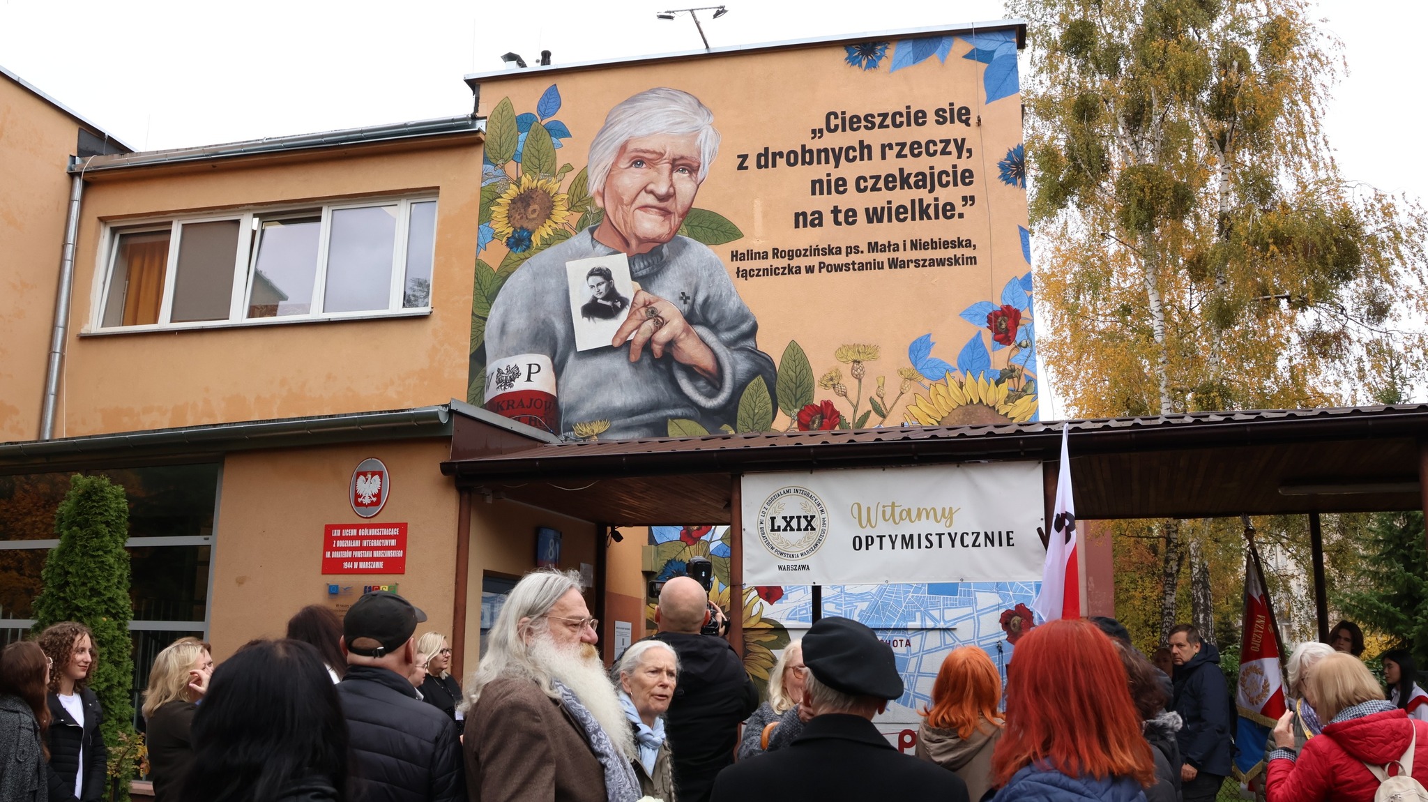 Ważnym punktem obchodów było odsłonięcie murala na terenie szkoły przez naszą Jubilatkę, przy udziale Pani Agnieszki Łesiuk-Krajewskiej z BohaterONu, Piotr Krasnodębski – Burmistrz Dzielnicy Ochota m. st. Warszawy oraz Dyrektor LXIX Liceum Ogólnokształcące, pani Anny Jaroszek. Przepiękna grafika przedstawia Panią Halinę Rogozińską i upamiętnia jej działalność w czasie Powstania. Mural będzie ważnym miejscem na historycznej i artystycznej mapie Ochoty.