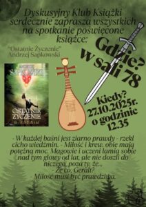Podczas październikowego spotkania Dyskusyjnego Klubu Książki rozmawialiśmy o „Ostatnim życzeniu” Andrzeja Sapkowskiego, czyli pierwszym tomie opowiadań o wiedźminie Geralcie z Rivii. Dyskusja była bardzo żywa – uczestnicy podzielili się różnymi opiniami na temat zarówno stylu autora, jak i złożoności świata przedstawionego. Spotkanie zakończyliśmy krótką rozmową o adaptacjach – serialu Netflixa oraz grach komputerowych – i ich wpływie na odbiór książki. Wszyscy zgodziliśmy się, że warto wrócić do literackiego pierwowzoru, by przypomnieć sobie, od czego wszystko się zaczęło.
