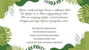 11 września 2023r. w naszym liceum odbyła się 12. odsłona Narodowego Czytania. W tym roku czytano najbardziej znaną powieść Elizy Orzeszkowej – „Nad Niemnem”. W akcji popularyzującej czytelnictwo wzięły udział klasy 1E oraz 2D. Nad projektem czuwały panie nauczycielki Natalia Kędzierska, Katarzyna Rewera – Malec oraz Magdalena Angielska – Jędrzejczyk. Wszystkich zachęcamy do czytania ,,Nad Niemnem” jak również innych dzieł Elizy Orzeszkowej.