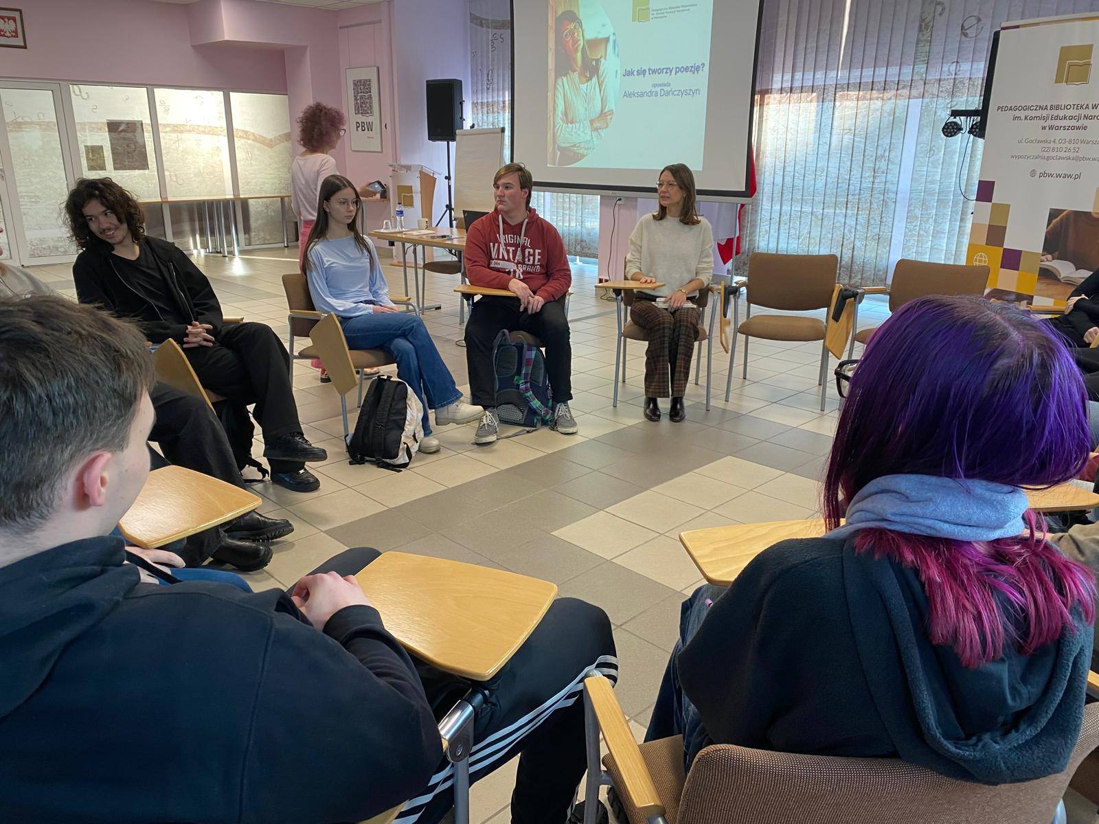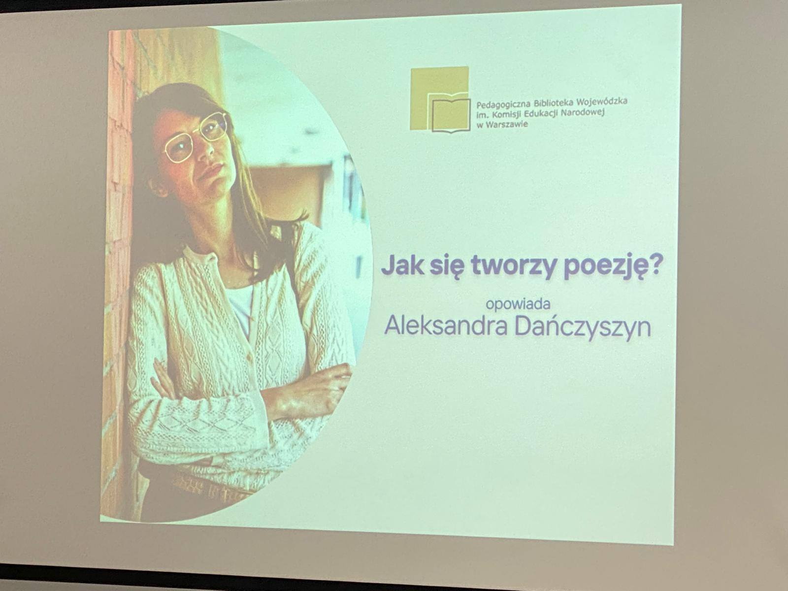 W piątek, w ramach współpracy z Pedagogiczną Biblioteką Wojewódzką im. KEN w Warszawie, uczniowie klas 3a i 3b wzięli udział w ciekawym i inspirującym spotkaniu autorskim pt. „Jak się tworzy poezję” z Aleksandrą Dańczyszyn – poetką i polonistką, autorką książek poetyckich: „Kochanie”, „Tiszert z Bangladeszu” oraz „Kiedy zaczniesz śpiewać”.